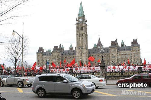 當(dāng)?shù)貢r間4月13日下午,近萬名來自加拿大各地的華人聚集在首都渥太華國會山廣場,舉行“宣傳西藏真相,維護(hù)祖國統(tǒng)一”大型集會活動。集會全程充滿“和平、友愛”的熱烈氣氛,組織者宣讀了中英文集會聲明和致加拿大總理哈珀公開信,表達(dá)海外華人“支持一個中國、支持北京奧運會,反對暴力”的心愿。中新社發(fā) 捷克佳 攝