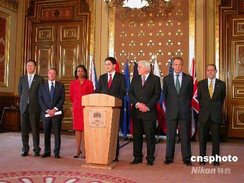 當(dāng)?shù)貢r(shí)間2日下午,伊朗核問(wèn)題六國(guó)外長(zhǎng)會(huì)議在倫敦舉行,就伊核問(wèn)題復(fù)談方案達(dá)成一致,決定盡快向伊朗送交。中國(guó)外交部部長(zhǎng)助理何亞非作為楊潔篪外長(zhǎng)代表出席會(huì)議。圖從左至右分別為:何亞非、法國(guó)外長(zhǎng)庫(kù)什內(nèi)、美國(guó)國(guó)務(wù)卿賴(lài)斯、英國(guó)外交大臣米利班德、德國(guó)外長(zhǎng)施泰因邁爾、俄羅斯外長(zhǎng)拉夫羅夫、歐盟共同外交與安全政策高級(jí)代表索拉納。中新社發(fā) 攝