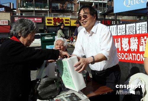 5月13日下午,在紐約第二大華埠——法拉盛,紐約華人社團(tuán)聯(lián)席會(huì)及屬下四川同鄉(xiāng)聯(lián)誼會(huì)在街頭募集捐款,援助四川地震災(zāi)區(qū),很多過(guò)往行人紛紛捐款。中新社發(fā) 譚宏偉 攝