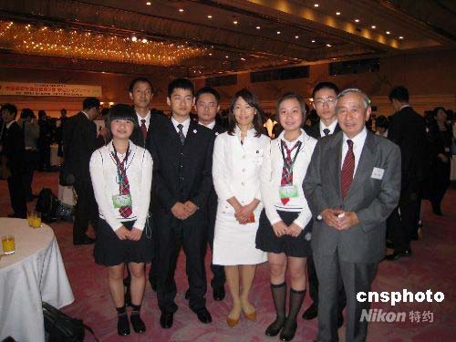 5月14日晚,由日本財團法人日中友好會館、社團法人日中友好協(xié)會主辦的歡迎中國高中生400人訪問團酒會在東京舉行。作為2008年“二十一世紀東亞青少年大交流計劃”的第二批,他們將參加與日中關(guān)系相關(guān)的研討會,走進日本高中課堂,在日本高中學(xué)生家庭住宿外,還將進行文化、經(jīng)濟、社會等方面的考察。圖為出席酒會的四川高中生和日中友好會館谷野作太郎副會長合影。中新社發(fā) 段躍中 攝