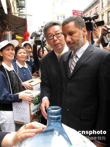 當(dāng)?shù)貢r間5月15日,紐約州長帕特森(右)和眾議長蕭華走訪華埠,一同來到紐約中華公所門前的賑災(zāi)籌款攤位。帕特森呼吁全體紐約州民乃至美國人行動起來,為中國四川地震災(zāi)民捐款賑災(zāi)。中新社發(fā) 張碔 攝