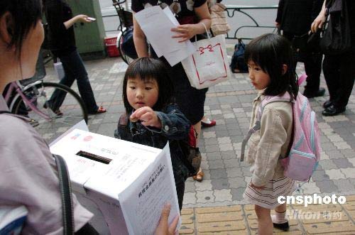 5月18日,一位日本小朋友為四川大地震災(zāi)區(qū)捐款。當(dāng)日,日本僑報(bào)社創(chuàng)辦的星期日漢語角舉行第40次交流會(huì),主題為“向四川震區(qū)人民獻(xiàn)愛心”募捐和義賣活動(dòng)。漢語角參加者來到繁華的池袋車站進(jìn)行街頭募捐,全力支援中國(guó)抗震救災(zāi)。中新社發(fā) 段躍中 攝