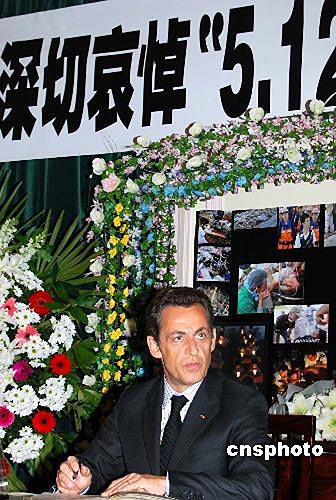 巴黎時間五月十九日下午,法國總統(tǒng)薩科奇來到中國駐法國大使館,對中國四川汶川地震遇難者表示深切哀悼。圖為薩科奇在留言簿上留言。中新社發(fā) 吳衛(wèi)中 攝