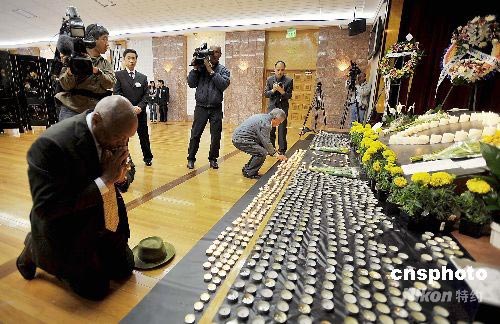當(dāng)?shù)貢r間五月二十一日,中國駐舊金山總領(lǐng)館大廳,舊金山前市長布朗在靈堂長跪,為中國汶川大地震遇難者默哀。布朗曾多次訪問中國,并參觀過四川臥龍大熊貓基地。他對大地震帶給汶川人民的巨大痛苦深感悲傷。中新社發(fā) 陳鋼 攝