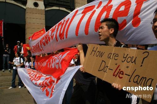 圖:華人青年抗議達(dá)賴?yán)镌L英