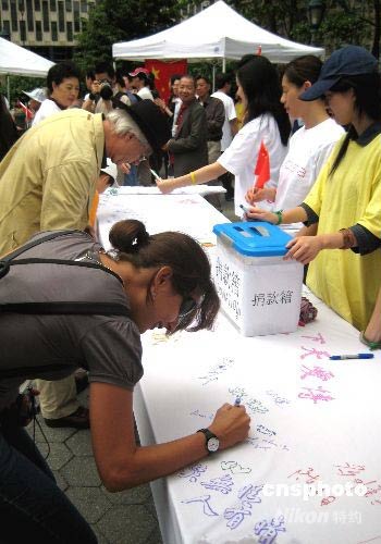 5月31日,由大紐約地區(qū)僑界、商界、學界共同發(fā)起的“手拉手,心連心,情系災區(qū),賑災助學”大型義演活動在紐約曼哈頓舉行。本次活動全部募捐所得款項都將轉交中國駐紐約總領事館,用于幫助四川災區(qū)兒童盡快重返校園。圖為觀看義演活動的外國友人捐款后在“災無情、人有情”的橫幅上簽名,祝福中國災區(qū)人民早日重建家園。中新社發(fā) 鄧悅 攝