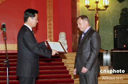 6月4日,中國駐俄羅斯大使劉古昌在使館為舉辦抗震救災(zāi)答謝招待會,感謝俄方對中國四川大地震救災(zāi)工作給予的大力支持和幫助。俄緊急救災(zāi)部副部長丘普里揚(yáng)上將和緊急救災(zāi)部赴華搜救隊(duì)、航空飛行隊(duì)成員等60余人出席。圖為劉古昌向丘普里揚(yáng)上將展示親筆書寫的感謝信。中新社發(fā) 田冰 攝