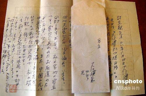 圖為大江健三郎寫(xiě)給許金龍的親筆信和裝捐款的信封。