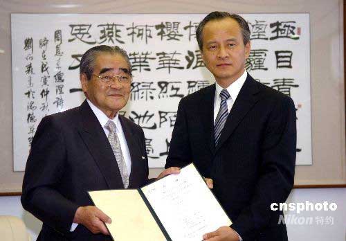 6月10日,日本永旺集團(tuán)名譽(yù)會(huì)長岡田卓也親赴中國駐日使館向崔天凱大使免呈了向四川地震災(zāi)區(qū)捐贈(zèng)1億6千9百余萬日元的捐款書。據(jù)悉,這筆捐款是自四川地震發(fā)生以來日本使館迄今為止收到的數(shù)額最大的單筆捐款,其中近一半的捐款約八千四百多萬日元為日本普通消費(fèi)者的捐贈(zèng)。圖為崔天凱大使接受岡田卓也會(huì)長的捐款目錄。中新社發(fā) 朱沿華 攝