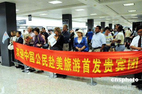 當(dāng)?shù)貢r(shí)間六月十七日晚,中國公民赴美旅游首發(fā)團(tuán)抵達(dá)華盛頓杜勒斯國際機(jī)場(chǎng),美國商務(wù)部、機(jī)場(chǎng)所在地郡政府和當(dāng)?shù)芈糜紊缭跈C(jī)場(chǎng)等待迎接首發(fā)團(tuán)到來。該團(tuán)在華盛頓將破例受到美國商務(wù)部重視,將以有史以來最高接待規(guī)格接待中國旅游團(tuán),為他們安排高規(guī)格行程。古鐵雷斯部長將親自接待二百四十名中國游客。中新社發(fā) 邱江波 攝
