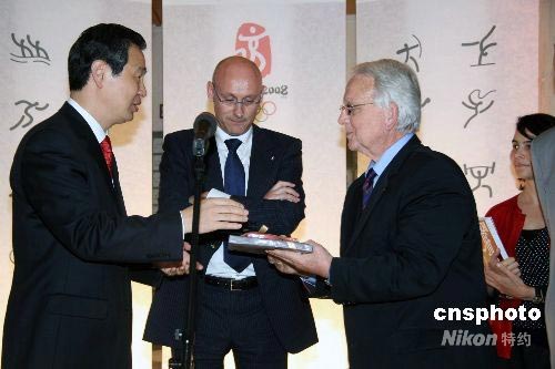 六月十九日晚,法國(guó)奧委會(huì)在巴黎舉行慶祝北京奧運(yùn)會(huì)迎來(lái)倒計(jì)時(shí)五十天儀式。圖為中國(guó)駐法大使孔泉(左一)向法國(guó)奧委會(huì)主席塞朗杜(左三)贈(zèng)送法文版新書(shū)《二00八北京奧運(yùn)建筑》。 中新社發(fā) 吳衛(wèi)中 攝