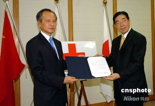 6月20日,中國駐日大使崔天凱前往位于東京的日本紅十字會(huì)代表中國政府向日本巖手宮城地震災(zāi)區(qū)提供10萬美金的救災(zāi)捐款,并再次對(duì)地震災(zāi)區(qū)人民表示慰問。圖為崔天凱與日本紅十字會(huì)會(huì)長近衛(wèi)忠煇。中新社發(fā) 朱沿華 攝