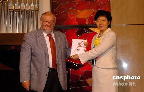 6月23日晚,由日本的NPO組織“支援亞洲孤兒之會”主辦的中國四川大地震孤兒救援義演音樂會在東京池袋舉行,中日兩國音樂家聯(lián)袂登臺,呼吁人們?yōu)樗拇ǖ卣鸸聝荷斐鲈。圖為“支援亞洲孤兒之會”會長REIJO BLOMMENDAHL在音樂會上代表該會向中國地震孤兒捐贈五千公斤小麥粉。中新社發(fā) 朱沿華 攝