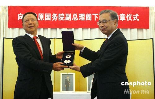 6月30日,日本授予中國(guó)前國(guó)務(wù)院副總理谷牧(本名劉家語(yǔ))先生旭日大勛章。谷牧也是第二位被授予這一榮譽(yù)的中國(guó)人。圖為日本國(guó)駐華大使宮本雄二(右)向谷牧先生長(zhǎng)子贈(zèng)送勛章。谷牧先生本人因身體原因未能出席本次授勛儀式。中新社發(fā) 富田 攝
