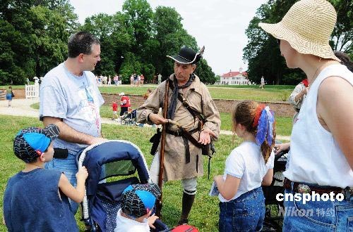 在美國開國總統(tǒng)喬治華盛頓的故居弗吉尼亞州芒特弗農(nóng),7月4日舉行了多種活動紀(jì)念美國國慶,許多人裝扮成二百多年前獨(dú)立戰(zhàn)爭時(shí)期的士兵,和游人合影,并且還舉行了鳴槍儀式。圖為華盛頓故居弗吉尼亞州芒特弗農(nóng)山莊的一個(gè)古裝士兵在展演手中的武器。中新社發(fā) 邱江波 攝