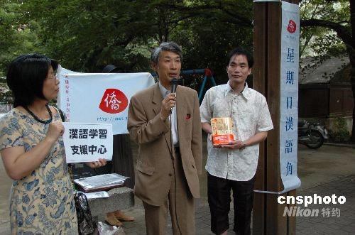 7月13日,在東京舉行的星期日漢語角第48次交流會(huì)上,日本僑報(bào)社宣布漢語學(xué)習(xí)支援中心正式成立。漢語學(xué)習(xí)支援中心的首個(gè)支援項(xiàng)目是,面向研究者的中文讀解力養(yǎng)成講座9月開講,由日本麗澤大學(xué)中文系三瀦正道教授擔(dān)綱,每周一下午5點(diǎn)至7點(diǎn)免費(fèi)為各大學(xué)的研究生和年輕學(xué)者、漢語學(xué)習(xí)者提供權(quán)威服務(wù)。圖為三瀦正道教授(中)向漢語角參加者介紹漢語學(xué)習(xí)支援中心。中新社發(fā) 段躍中 攝