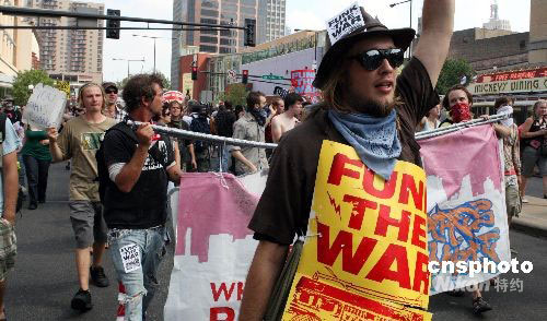 來(lái)自全美各地的數(shù)千名反戰(zhàn)人士一日在位于明尼蘇達(dá)州首府圣保羅的共和黨全國(guó)代表大會(huì)會(huì)場(chǎng)外示威,反對(duì)即將獲得共和黨總統(tǒng)候選人提名的亞利桑那州國(guó)會(huì)參議員麥凱恩支持布什政府的伊拉克政策。中新社發(fā) 李靜 攝