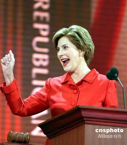9月2日,美國(guó)第一夫人勞拉出席在明尼蘇達(dá)州州府圣保羅舉行的共和黨全國(guó)代表大會(huì)時(shí)表示,為阿拉斯加州州長(zhǎng)薩拉·佩林有望成為美國(guó)歷史上第一位女副總統(tǒng)而感到驕傲。中新社發(fā) 李靜 攝