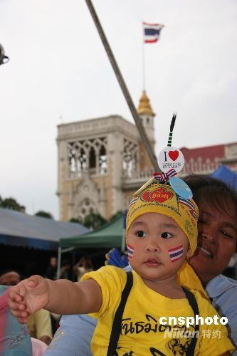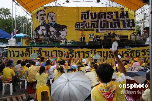 盡管泰國憲法法院九月九日已經(jīng)判決總理沙瑪因主持電視節(jié)目違背憲法無資格當(dāng)總理,但占據(jù)總理府的民盟示威者依然沒有離去。中新社發(fā) 顧時(shí)宏 攝