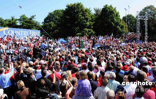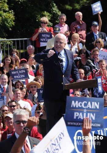 美國共和黨總統(tǒng)、副總統(tǒng)候選人約翰·麥凱恩和薩拉·佩林10日現(xiàn)身大華盛頓地區(qū)的弗吉尼亞州菲爾法克斯郡為競(jìng)選造勢(shì),支持者高呼“麥凱恩--合眾國”的口號(hào),手舉麥凱恩、佩林的標(biāo)語牌。中新社發(fā) 邱江波 攝