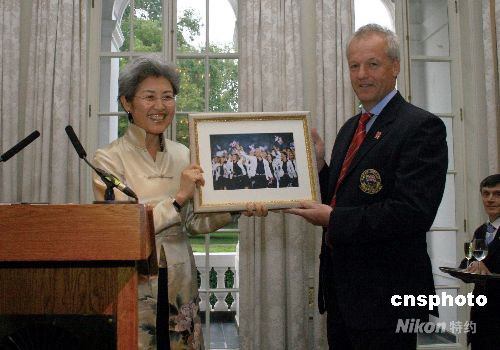 當(dāng)?shù)貢r(shí)間17日晚,中國駐英使館在倫敦文華東方酒店舉辦招待會,慶祝北京奧運(yùn)會和殘奧會的閉幕。圖為中國駐英大使傅瑩(左)向英國奧委會首席執(zhí)行官西蒙·克萊格贈送英國隊(duì)進(jìn)入鳥巢體育場時(shí)的照片。 中新社發(fā) 李鵬 攝