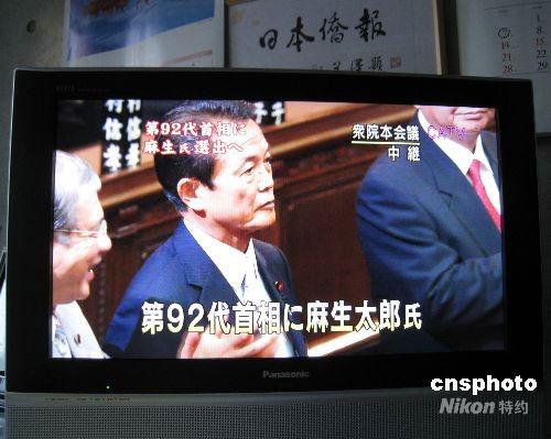 東京時(shí)間9月24日下午5時(shí),日本自民黨新總裁麻生太郎在臨時(shí)國(guó)會(huì)首相指名選舉中當(dāng)選日本第92代日本首相。圖為當(dāng)選瞬間的麻生太郎。中新社發(fā) 段躍中 攝
