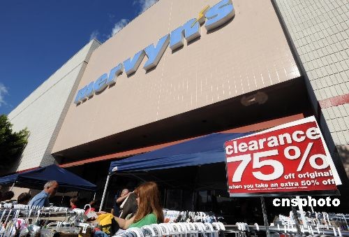 十月十八日,洛杉磯附近一家Mervyns百貨店打出削價(jià)百分之七十五清貨的告示,消費(fèi)者正在選購(gòu)清貨甩賣的服裝。擁有五十九年歷史的美國(guó)老牌連鎖百貨公司Mervyns剛剛成為美國(guó)經(jīng)濟(jì)滑坡的新?tīng)奚。這家已經(jīng)申請(qǐng)破產(chǎn)保護(hù)的百貨公司周五宣布,旗下一百四十九家商店進(jìn)行清貨銷售,然后關(guān)門停業(yè)。美國(guó)金融危機(jī)已經(jīng)蔓延到實(shí)體經(jīng)濟(jì),十月份美國(guó)消費(fèi)信心指數(shù)創(chuàng)下三十年來(lái)最大月度跌幅。中新社發(fā) 張煒 攝
