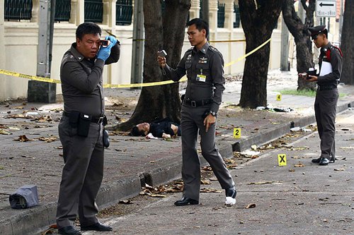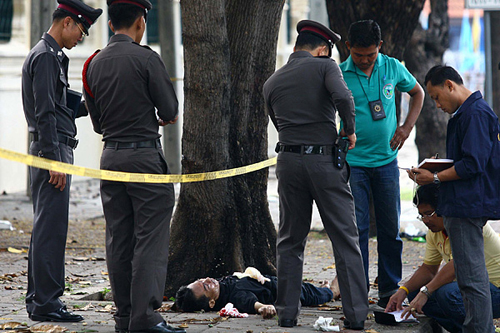 10月30日,在泰國(guó)首都曼谷,泰警方在檢查一名男子的尸體。當(dāng)日,泰國(guó)反政府的人民民主聯(lián)盟(民盟)設(shè)在曼谷馬卡萬(wàn)橋的集會(huì)點(diǎn)發(fā)生爆炸事件,之后總理府附近又發(fā)生槍擊事件,至少造成1人死亡、10人受傷。