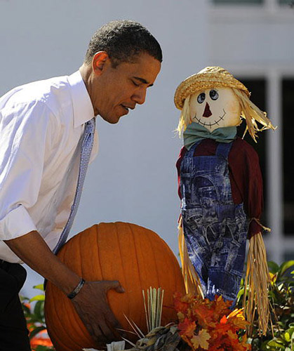 10月30日,在美國佛羅里達(dá)州的薩拉索塔,選戰(zhàn)中四處奔走的美國民主黨總統(tǒng)候選人奧巴馬忙里偷閑,來到當(dāng)?shù)氐囊患夷瞎蠄@摘南瓜,享受片刻悠閑。
