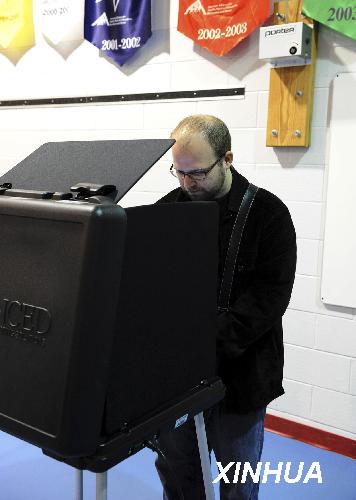 在美國弗吉尼亞州阿靈頓縣克伊小學(xué)投票站,一名選民參加投票。