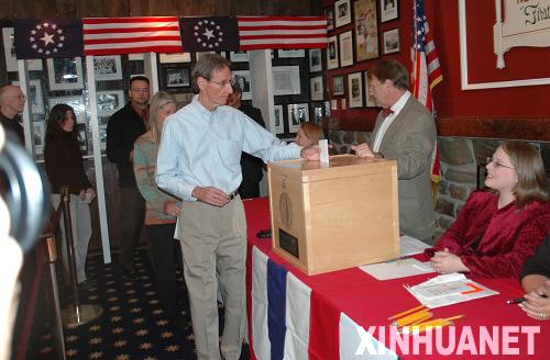 在美國新罕布什爾州北部的迪克斯維爾山口小鎮(zhèn),人們排隊(duì)投票。