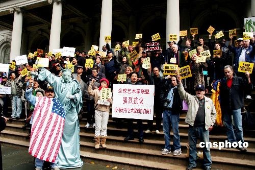 數(shù)百名紐約街頭藝人14日在紐約市政廳外集會(huì),代表三萬紐約同行,抗議紐約市府正在討論的、意在變相取締街頭藝術(shù)家的21條新條例。一旦條例通過,數(shù)千活躍在在紐約街頭的藝術(shù)家將飯碗不保,無以為繼。中新社發(fā) 魏晞 攝