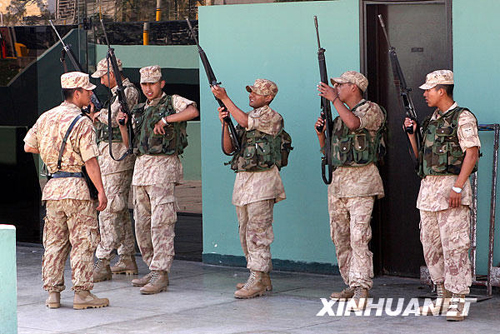 11月16日,在秘魯首都利馬的亞太經(jīng)合組織(APEC)領(lǐng)導(dǎo)人非正式會(huì)議國際新聞中心,執(zhí)勤士兵檢查槍械。秘魯軍方日前在利馬部署了近一萬名士兵,以確保將于11月22日至23日舉行的APEC第十六次領(lǐng)導(dǎo)人非正式會(huì)議安全舉行。