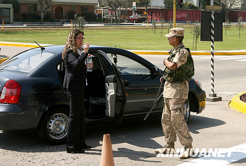11月16日,在秘魯首都利馬的亞太經(jīng)合組織(APEC)領(lǐng)導(dǎo)人非正式會(huì)議國際新聞中心,執(zhí)勤士兵檢查車輛。新華社記者 張傳奇 攝