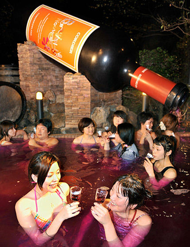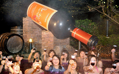 近日,一年一度的法國“博若萊”鮮葡萄酒開瓶日到來。由于時(shí)差原因,日本飲者得以先嘗為快,小涌園美酒溫泉浴活動(dòng)也由此開始。在日本箱根的小涌園溫泉浴場,客人們泡在鮮葡萄酒溫泉中舉杯慶祝。