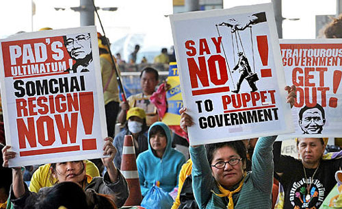 11月28日,泰國反政府的人民民主聯(lián)盟(民盟)支持者在曼谷素萬那普國際機場內繼續(xù)抗議。泰國總理頌猜27日晚在泰國北部城市清邁發(fā)表全國電視講話,宣布在曼谷素萬那普國際機場和廊曼機場實施緊急狀態(tài)法。但是民盟支持者依舊占領著這兩個機場。