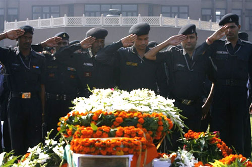 29日,數(shù)名印度國(guó)家安全衛(wèi)隊(duì)的突擊隊(duì)員向在孟買恐怖襲擊案中犧牲的隊(duì)友敬禮。在持續(xù)兩天多的印度孟買連環(huán)恐怖襲擊案中,至少造成195人死亡,其中包括22名非印度籍人士,另有近300人受傷。