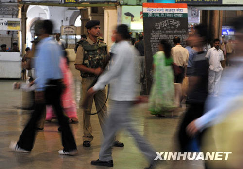 印度警察在CST火車(chē)站內(nèi)駐守。