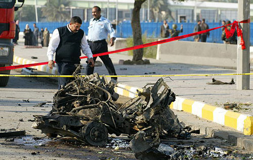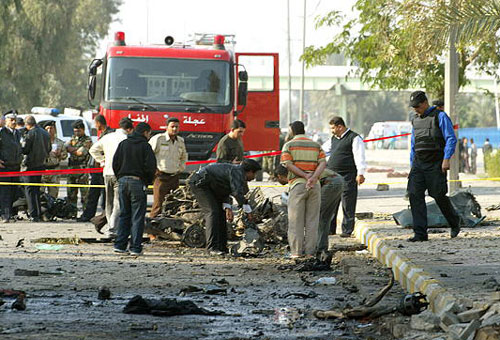 12月1日,在伊拉克首都巴格達(dá),伊拉克警察在巴格達(dá)警校大門外發(fā)生的自殺式汽車爆炸現(xiàn)場檢查。據(jù)報(bào)道,當(dāng)天發(fā)生在巴格達(dá)警校的爆炸襲擊造成15人死亡,另有45人受傷。
