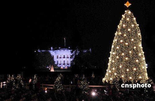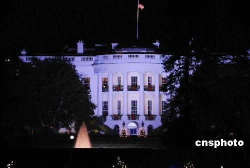 當(dāng)?shù)貢r間12月4日晚,美國華盛頓白宮南草坪萬人聚集,美國總統(tǒng)布什和夫人勞拉出席2008年“國家圣誕樹”點(diǎn)亮儀式。白宮南草坪的“國家圣誕樹”點(diǎn)亮儀式最早開始于1923年,白宮的主人都會在每年十二月第一周點(diǎn)亮這棵大型的圣誕樹和周圍栽種著象征美國五十個州小樹上的燈珠。圖為當(dāng)夜白宮在圣誕樹的映照下。中新社發(fā) 邱江波 攝
