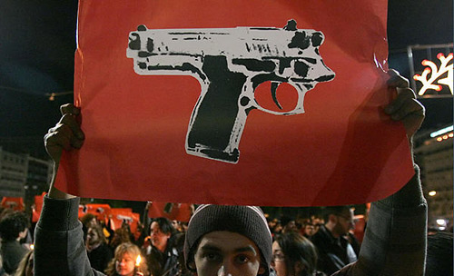12月9日,在希臘雅典,民眾舉行和平集會,抗議警察打死15歲的少年格里戈羅普洛斯。格里戈羅普洛斯的葬禮當(dāng)天在雅典郊外舉行。12月6日晚,這名少年在沖突中被警察開槍打死,由此引發(fā)希臘全國主要城市多日騷亂。