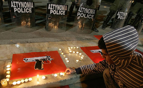 一名青年點燃蠟燭,悼念被警察打死的15歲少年格里戈羅普洛斯。