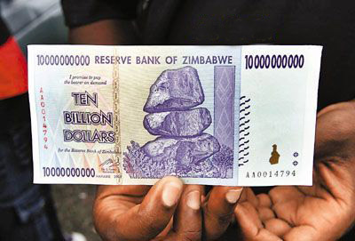 津巴布韋政局動(dòng)蕩,經(jīng)濟(jì)惡化和嚴(yán)重通脹,央行前日起正式發(fā)行面額為10億、50億和100億的新鈔,創(chuàng)下世界之最。該國一周前才發(fā)行了面額1千萬、5千萬和1億的3種新鈔。