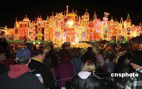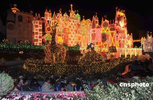 十二月二十三日晚,加州迪斯尼樂園以盛大的燈飾秀吸引眾多游客。美國經(jīng)濟(jì)持續(xù)不景氣,各類主題公園的生意蒙上陰影。為了抵御經(jīng)濟(jì)衰退帶來的民眾消費力下降,加州迪斯尼樂園在圣誕假期推出一系列新穎節(jié)目和促銷活動,招攬更多游客。中新社發(fā) 張煒 攝