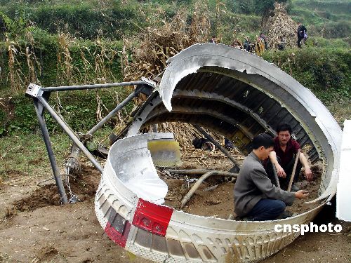 10月24日18時(shí)05分,在西昌衛(wèi)星發(fā)射中心發(fā)射的“嫦娥一號(hào)”衛(wèi)星,任務(wù)代號(hào)“07——34”,一級(jí)火箭殘骸成功著落于貴州福泉道坪鎮(zhèn)上平果村民組。殘骸 外殼著落于該村民組玉米地面,殘骸著落于一吳姓村民房屋中梁,全村民無(wú)人受傷。目前相關(guān)部門正在組織人員拆卸回收。中新社發(fā) 易勝武 攝