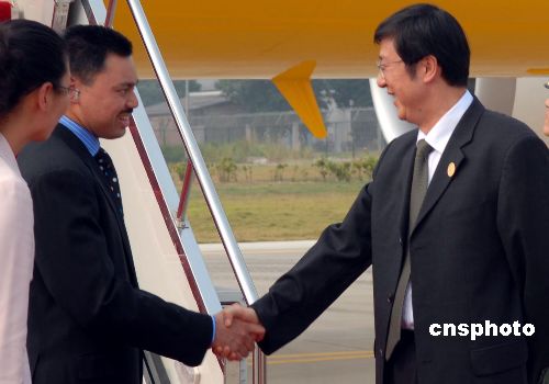 十月二十六日下午,文萊王儲(chǔ)比拉(左二)飛抵廣西南寧市,出席將于十月二十八日開幕的第四屆中國—東盟博覽會(huì)。圖為文萊王儲(chǔ)比拉在南寧國際機(jī)場(chǎng)受到廣西自治區(qū)黨委宣傳部長(zhǎng)沈北海等廣西官員的歡迎。中新社發(fā) 蔣雪林 攝