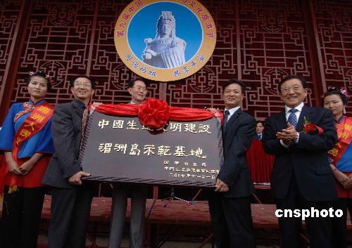 11月1日,中共中央委員、國家林業(yè)局局長賈治邦(右二)、中國生態(tài)道德教育促進(jìn)會理事長陳壽朋(左三)在第九屆中國.湄州媽祖文化旅游節(jié)開幕式上共同為中國第一個(gè)生態(tài)文明建設(shè)示范基地——福建莆田湄洲島基地授牌。當(dāng)天,媽祖故鄉(xiāng)福建莆田湄洲島成立了中國第一個(gè)生態(tài)文明建設(shè)示范基地。中新社發(fā) 劉可耕 攝