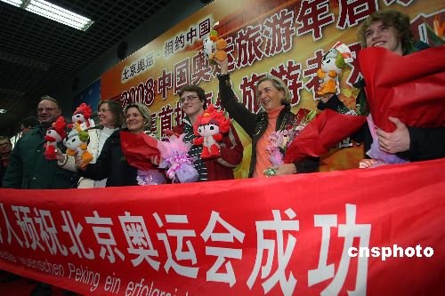 1月1日,首批境外游客抵達(dá)北京首都機(jī)場,與此同時(shí),2008中國奧運(yùn)旅游年活動(dòng)宣布啟動(dòng)。中新社發(fā) 杜洋 攝