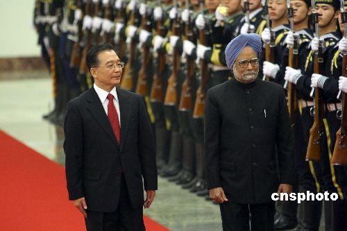1月14日,中國國務院總理溫家寶在北京人民大會堂舉行儀式,歡迎來訪的印度總理辛格。中新社發(fā) 盛佳鵬 攝