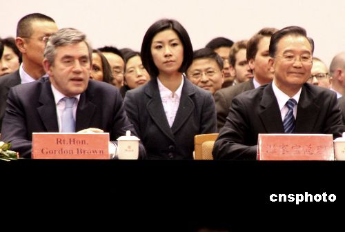 十八日下午,中國總理溫家寶與來華訪問的英國首相布朗,在中國人民大學(xué)“世紀(jì)館”觀看中英乒乓球友誼賽,并與運(yùn)動員進(jìn)行了交流。中新社發(fā) 周兆軍 攝